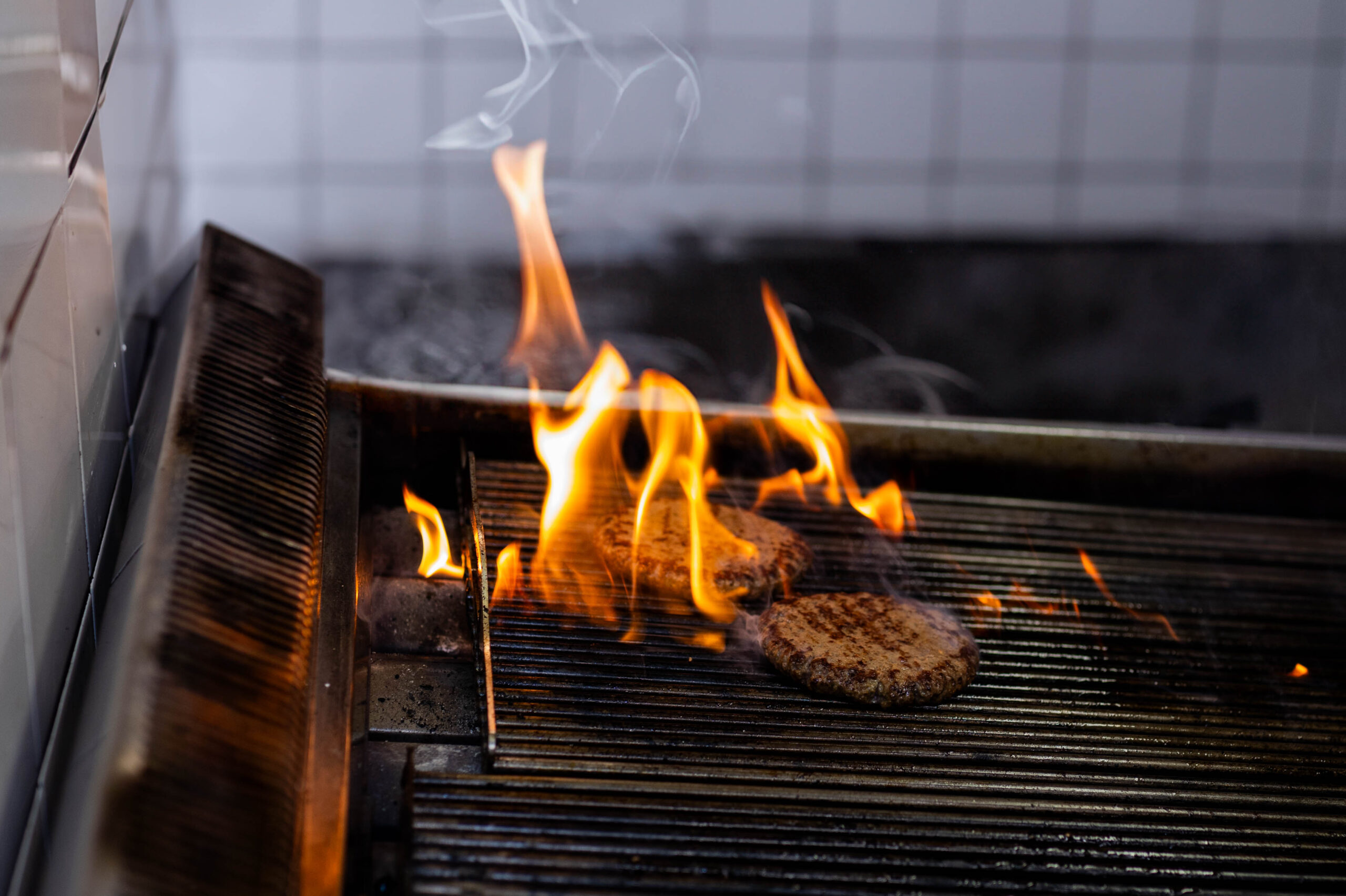 Grillet hakkebøf med bacon, smurt med hvidløgs-mayo.